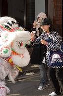 Lion Dance and Chinese crackers in a performance for Chinese new year.
