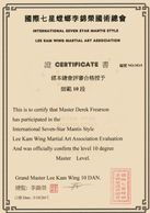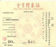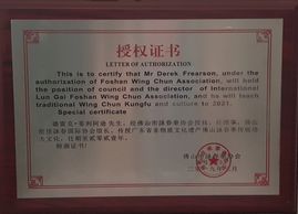 This is to certify that Derek Frearson, under the authorization of the Foshan Wing Chun Association, will hold the position of council and director of the International Lun Gai Foshan Wing Chun Association, and will teach traditional Wing Chun Kung Fu and culture to 2021. Special Certificate